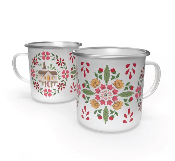 The Home Town Holiday Enamel Tin Mug by Lori Holt of Bee in my Bonnet features motifs from her chapel print in the Home Town Holiday collection. The mug holds 20 ounces of your favorite beverage or is great for storing pens and other items. Hand wash.